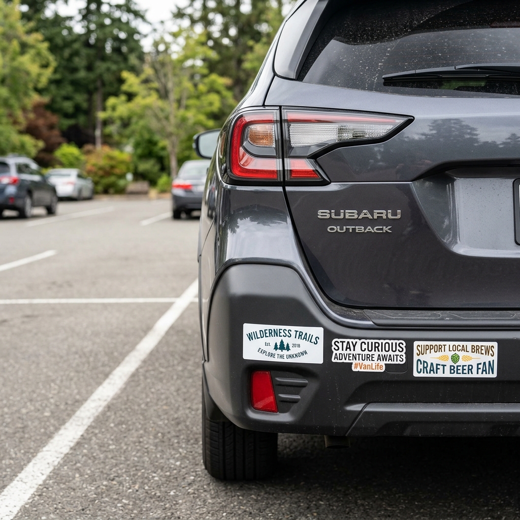 Weatherproof stickers designed for cars and outdoor use.